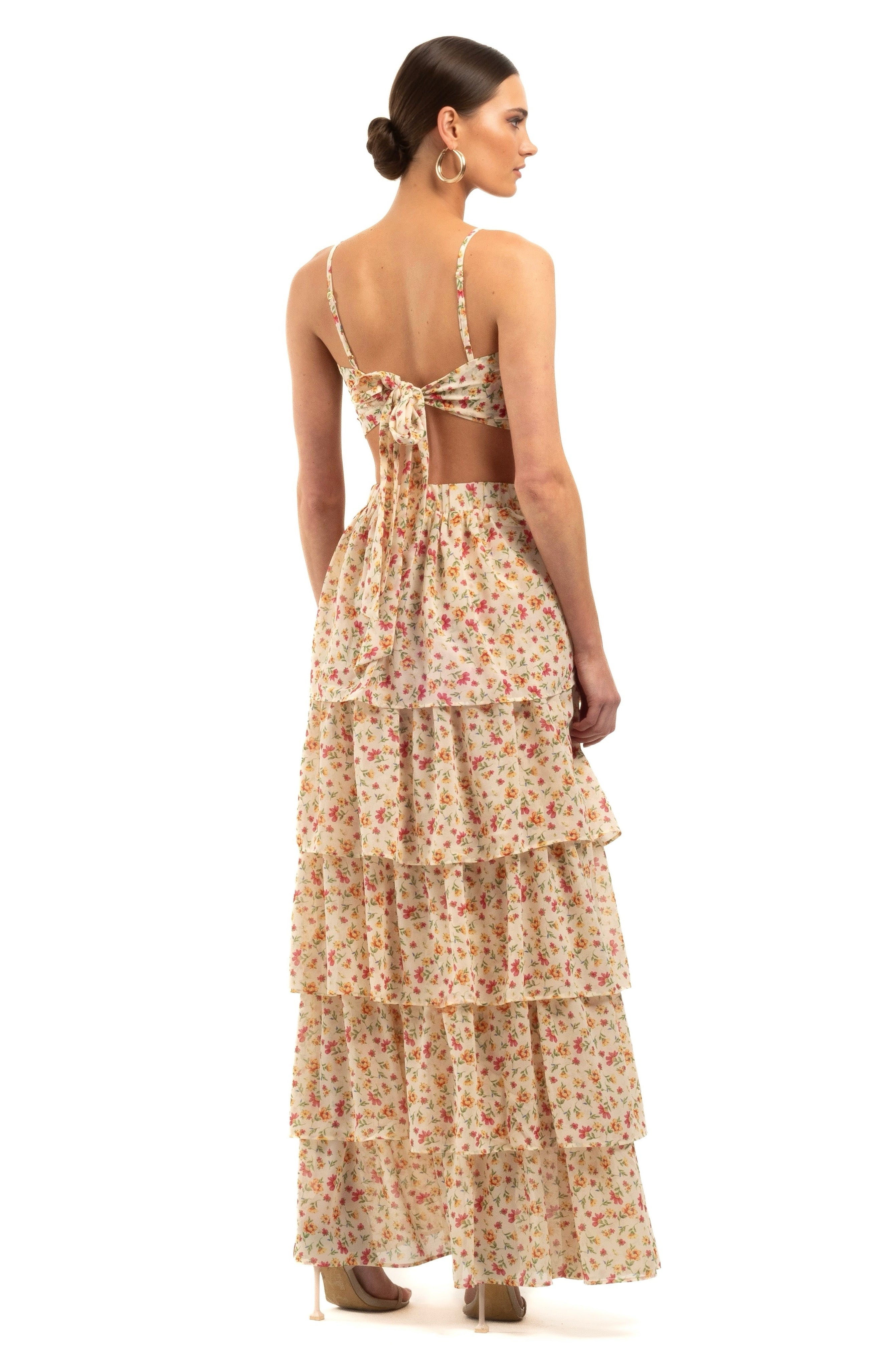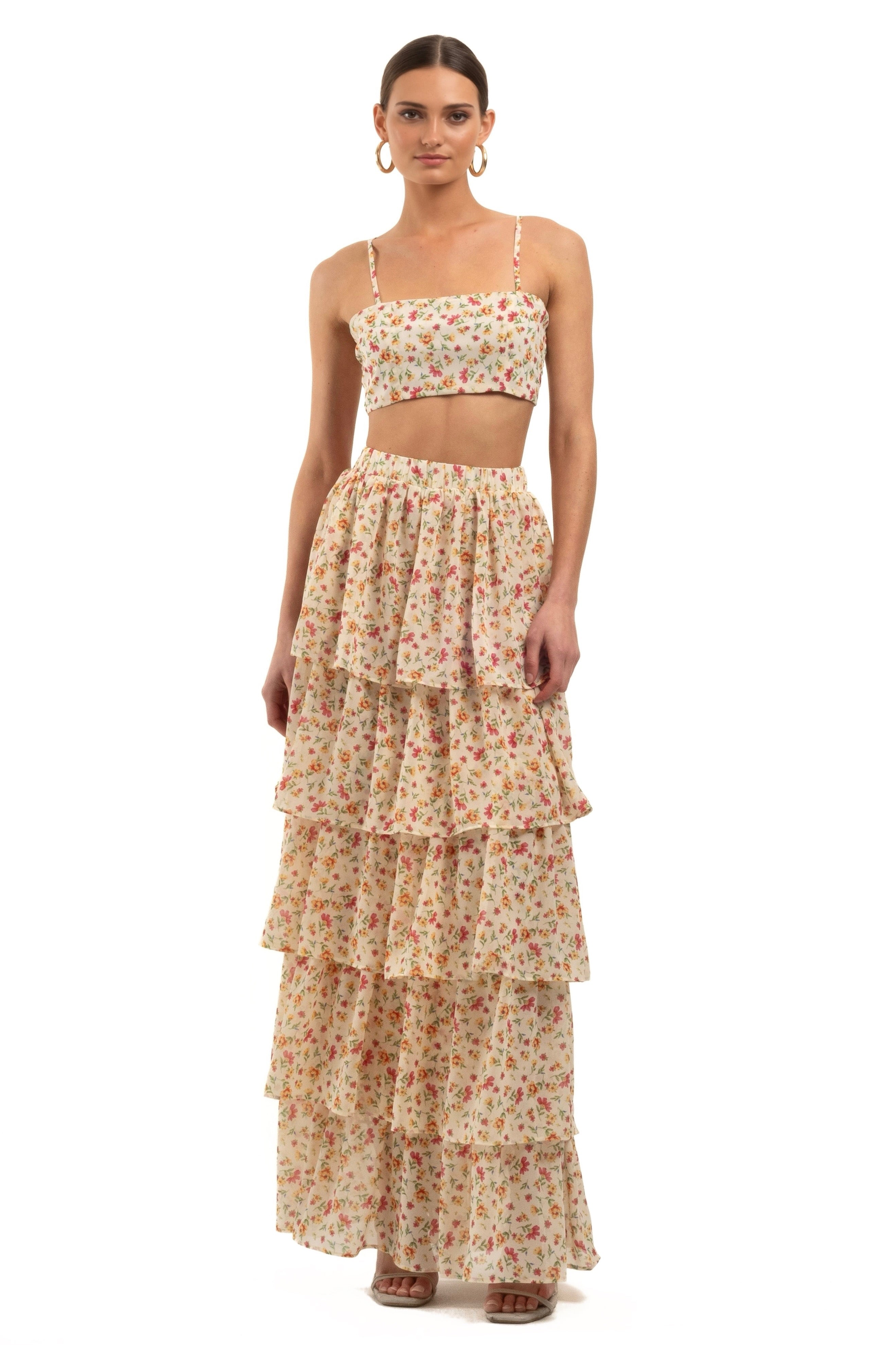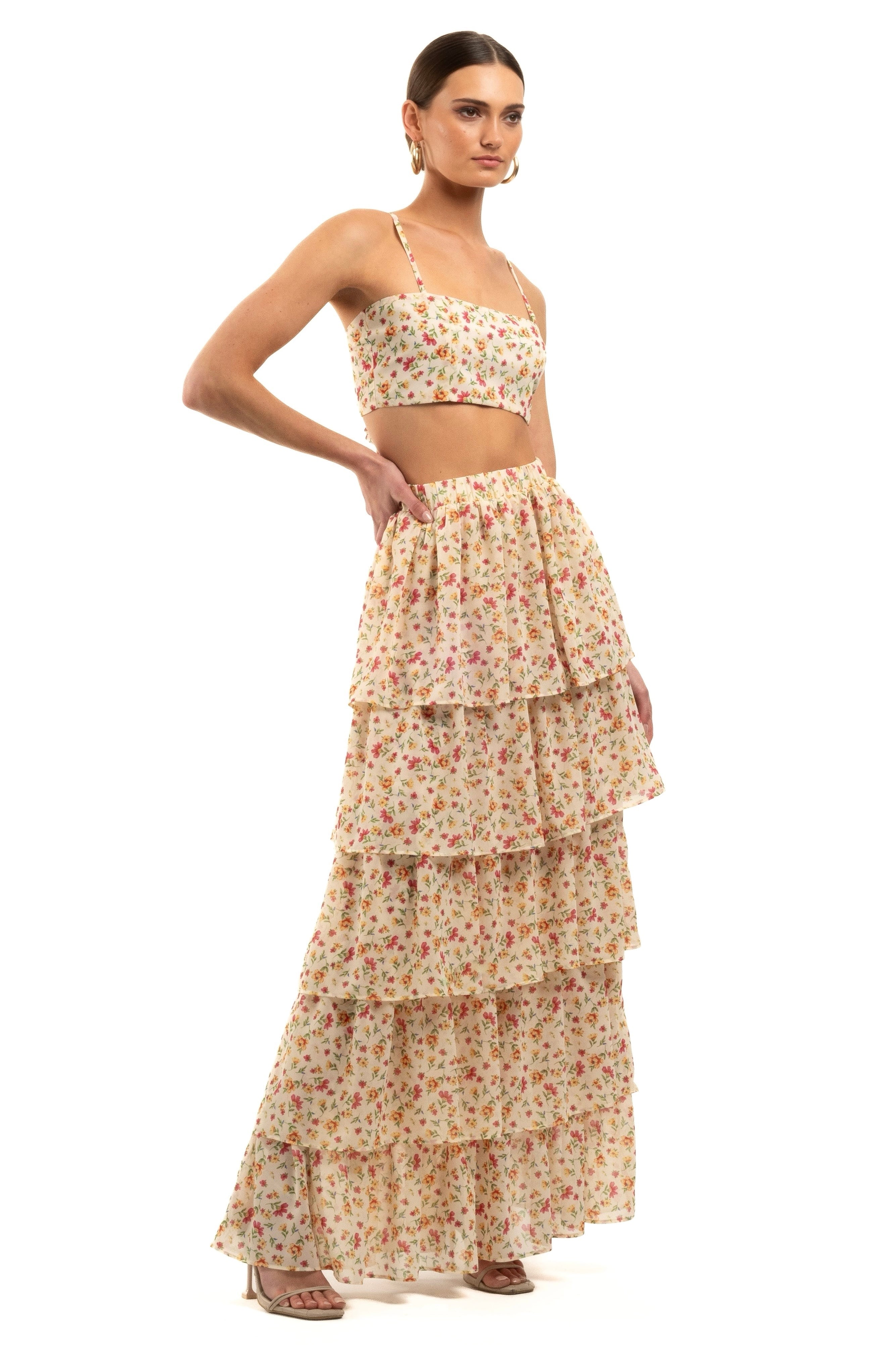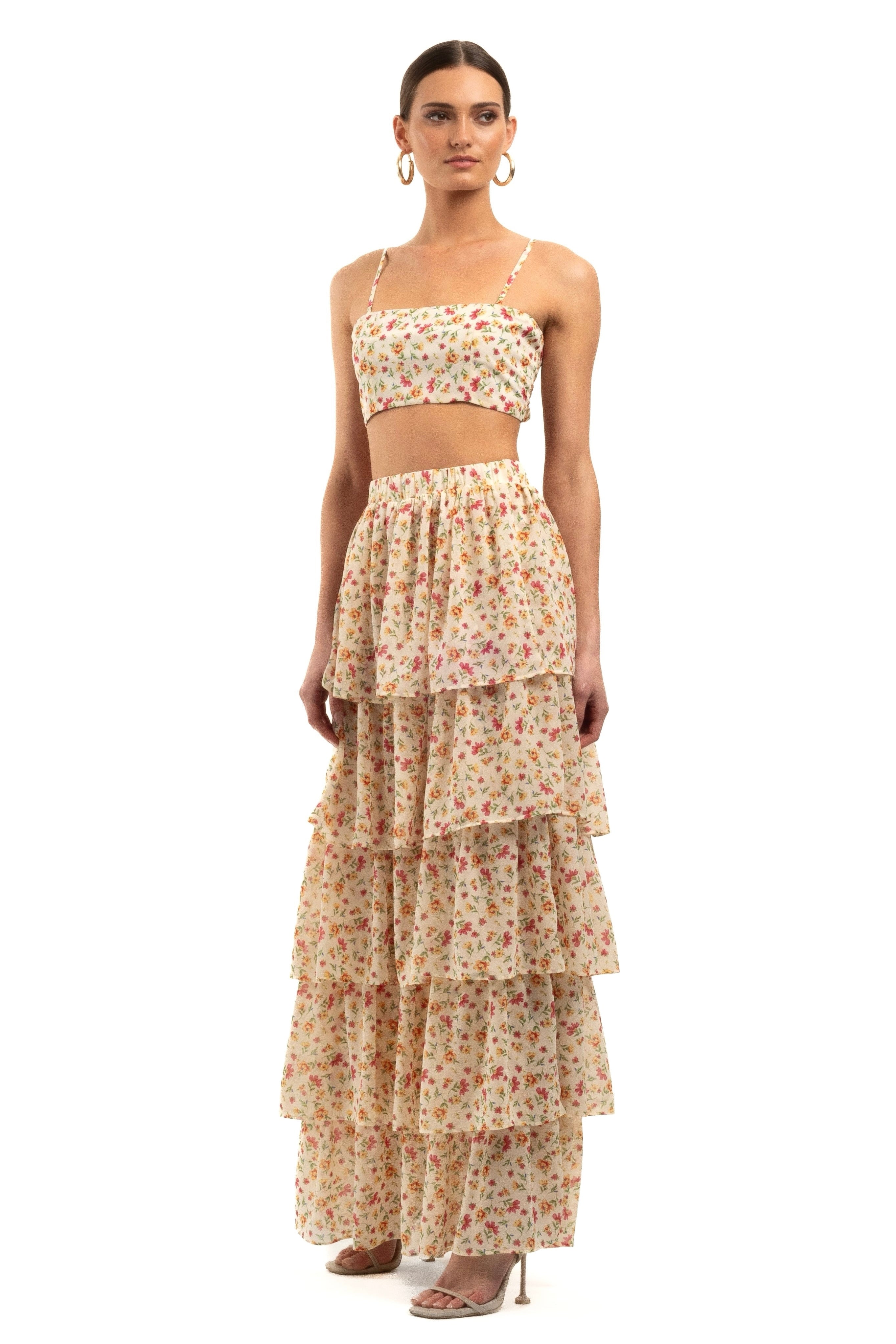 Embrace your femininity with our Leorah Maxi Frill Skirt. Crafted from lightweight floral chiffon, this skirt features five delicate frills that add a whimsical touch to your look. The skirt is lined for added comfort and has an elasticated waist, ensuring a perfect fit every time.