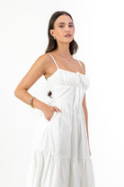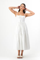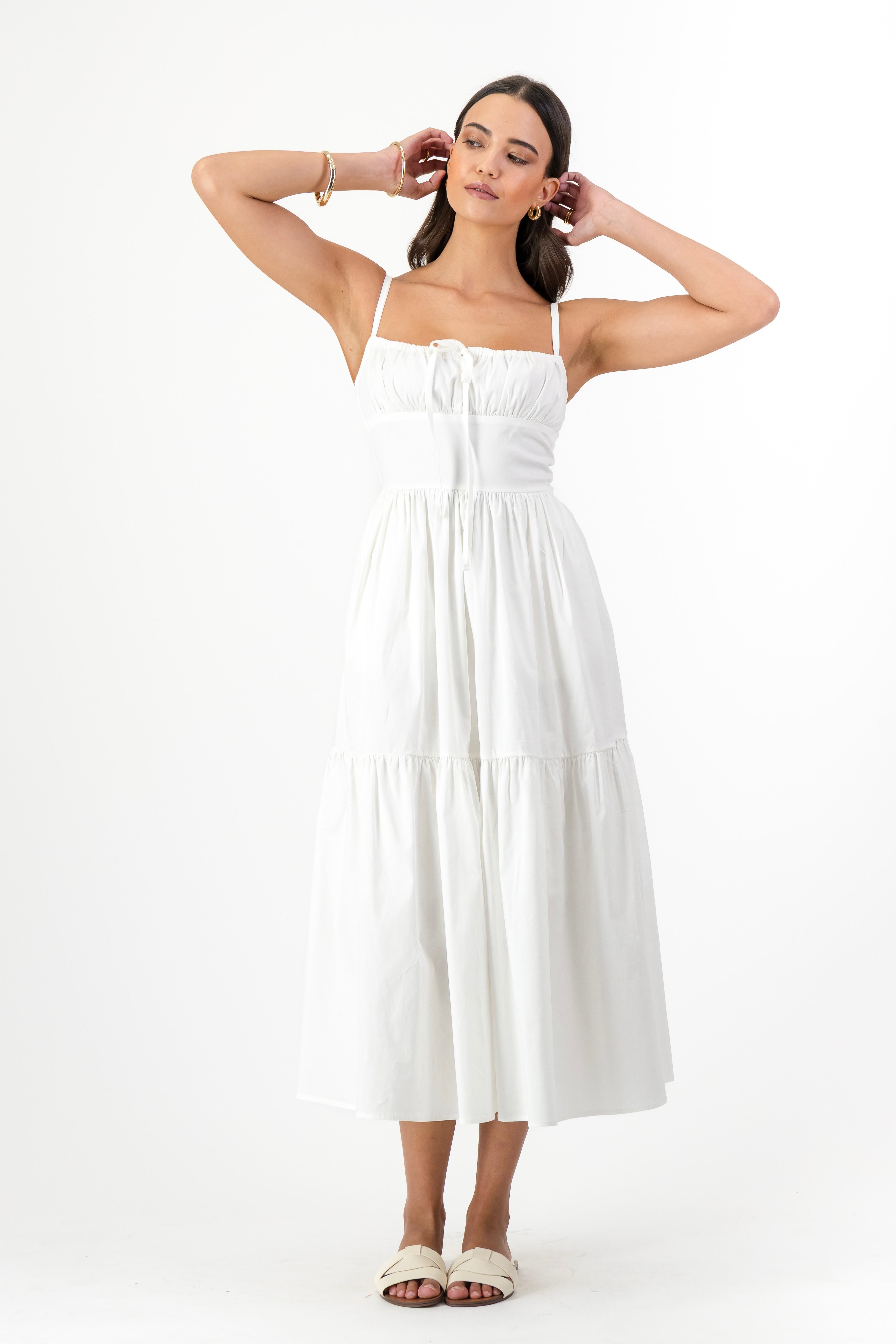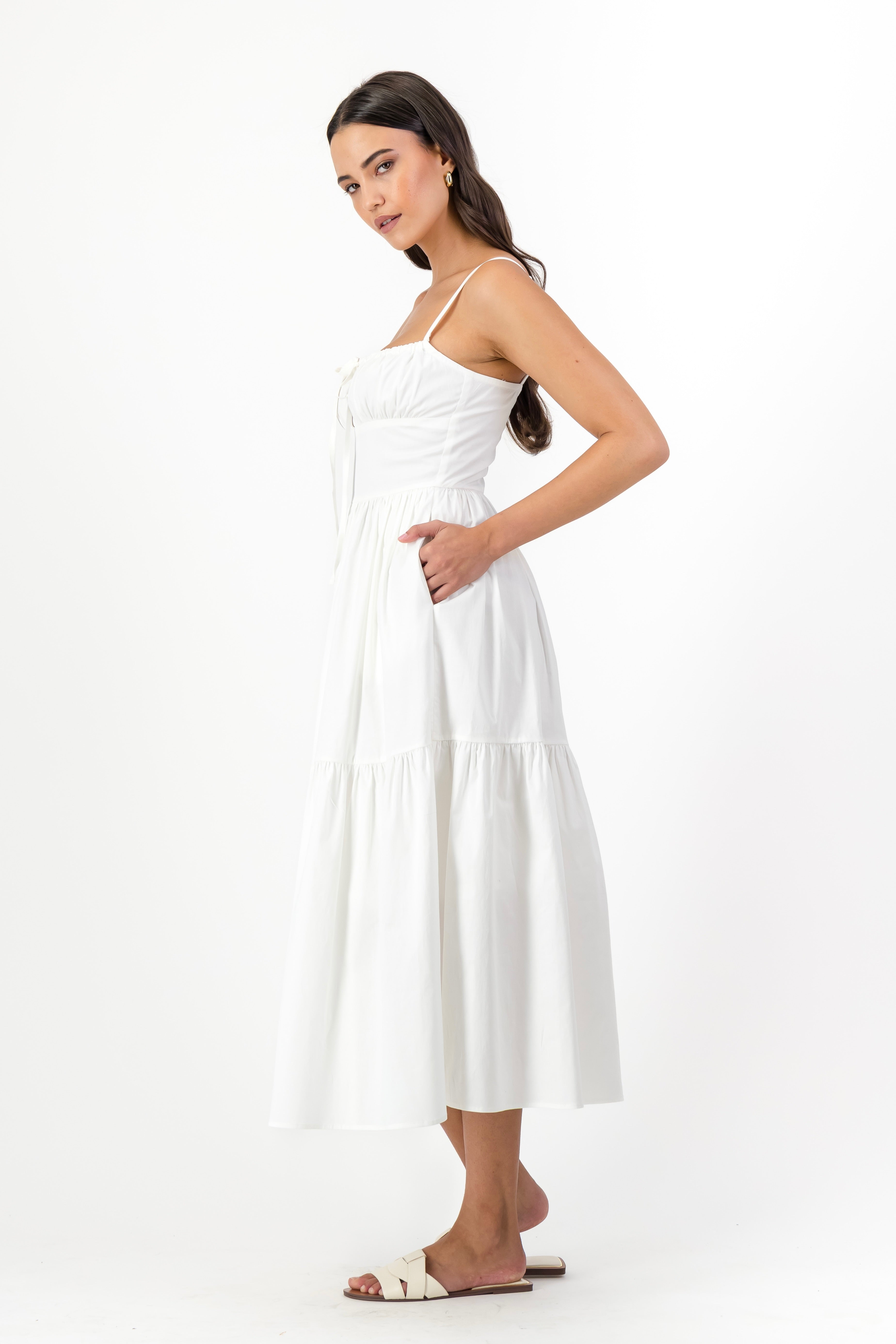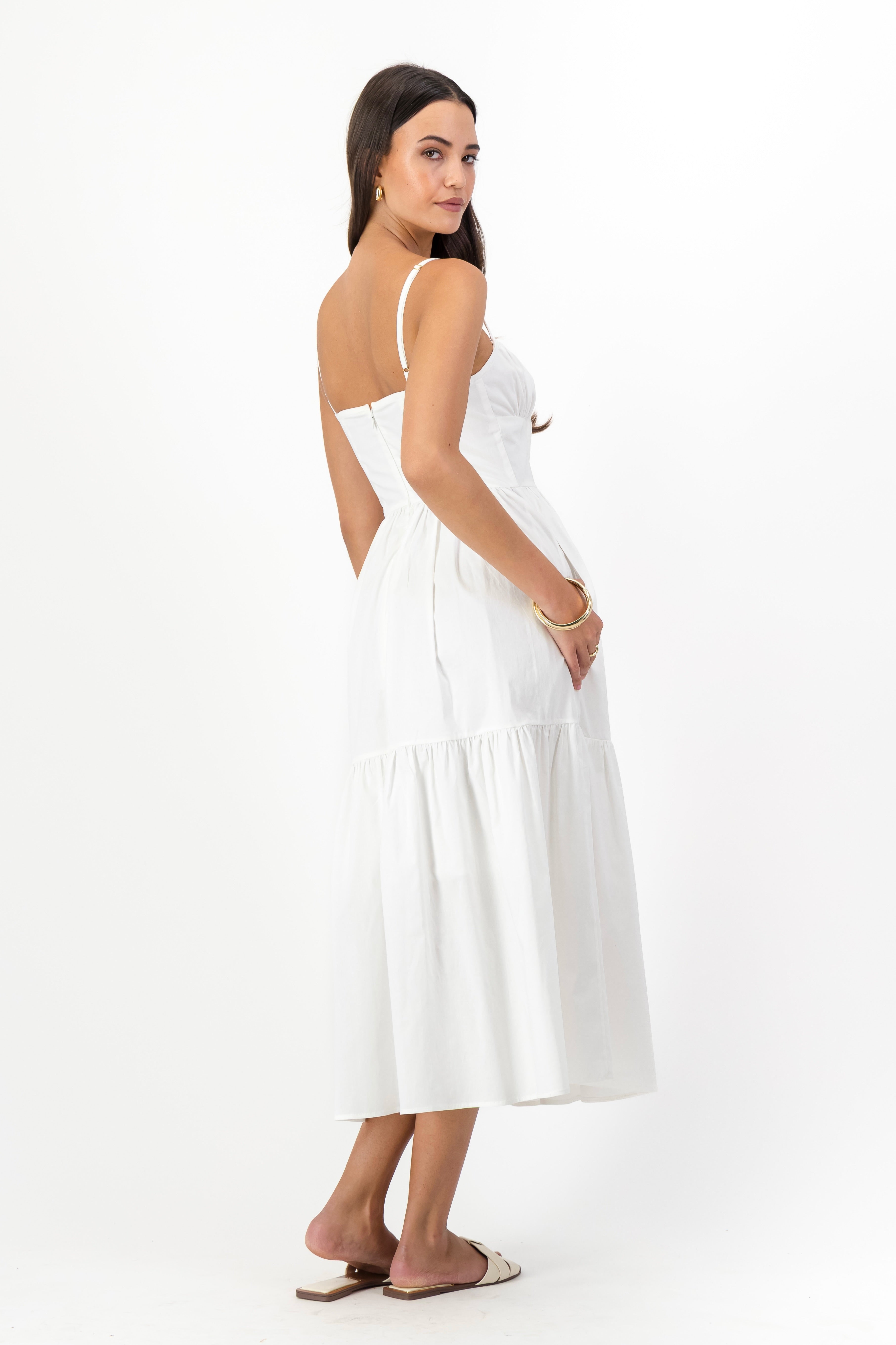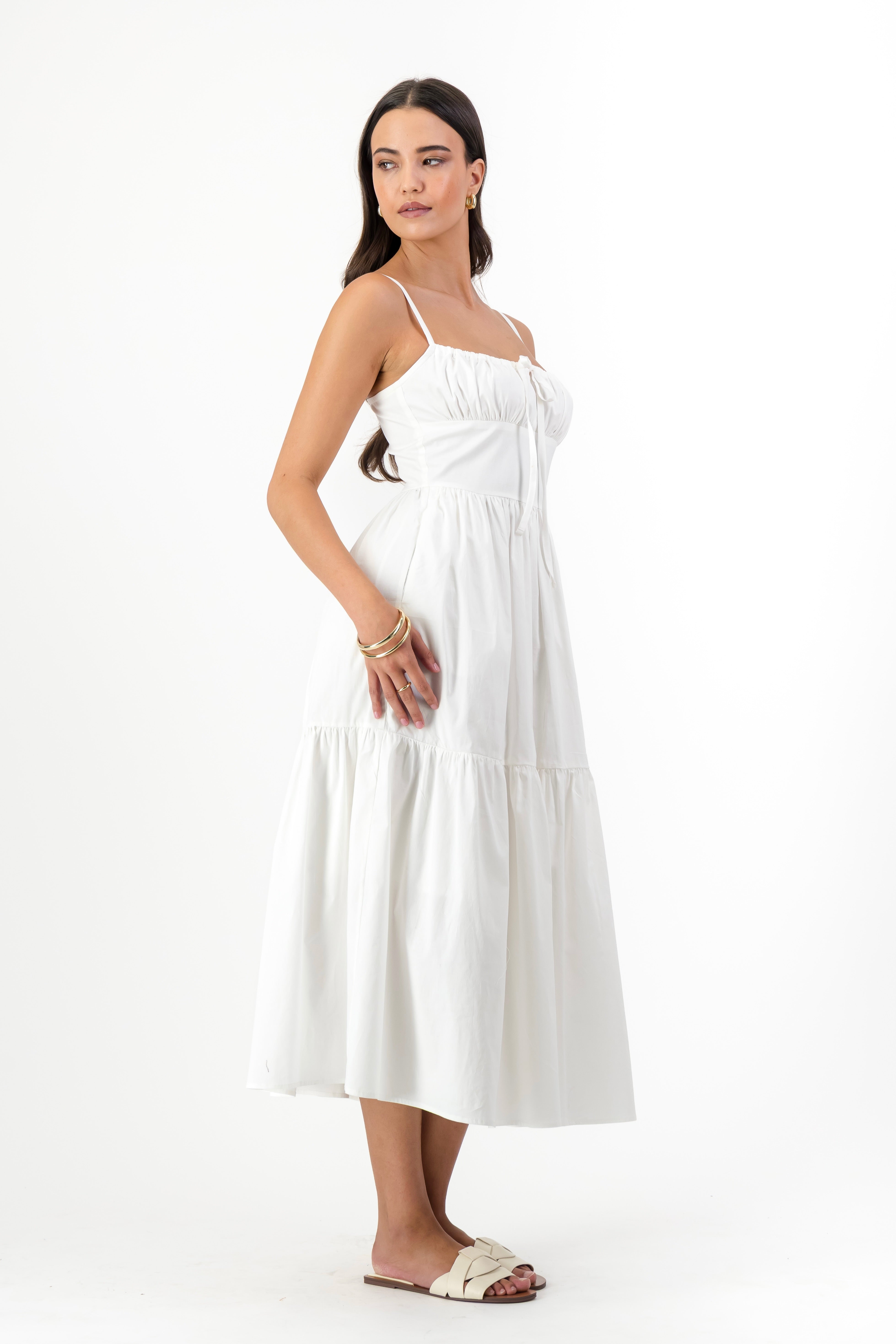 Crafted from 100% cotton and fully lined for comfort, she features adjustable shoulder straps and a flattering bust tie that lets you shape her perfectly to you. The fitted waist softly defines your silhouette, while the flowing midi skirt catches the breeze with every step. A center-back zip and delicate hook-and-eye fastening complete the look — timeless, minimal, and quietly romantic.
