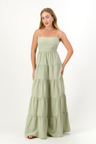 The Avery Summer Dress is the definition of easy elegance. With a clean square neckline, delicate straps, and a softly fitted bodice, it falls into a tiered maxi skirt that moves beautifully with every step. The moment is the V-shaped back — subtle from the front, unforgettable as you turn.