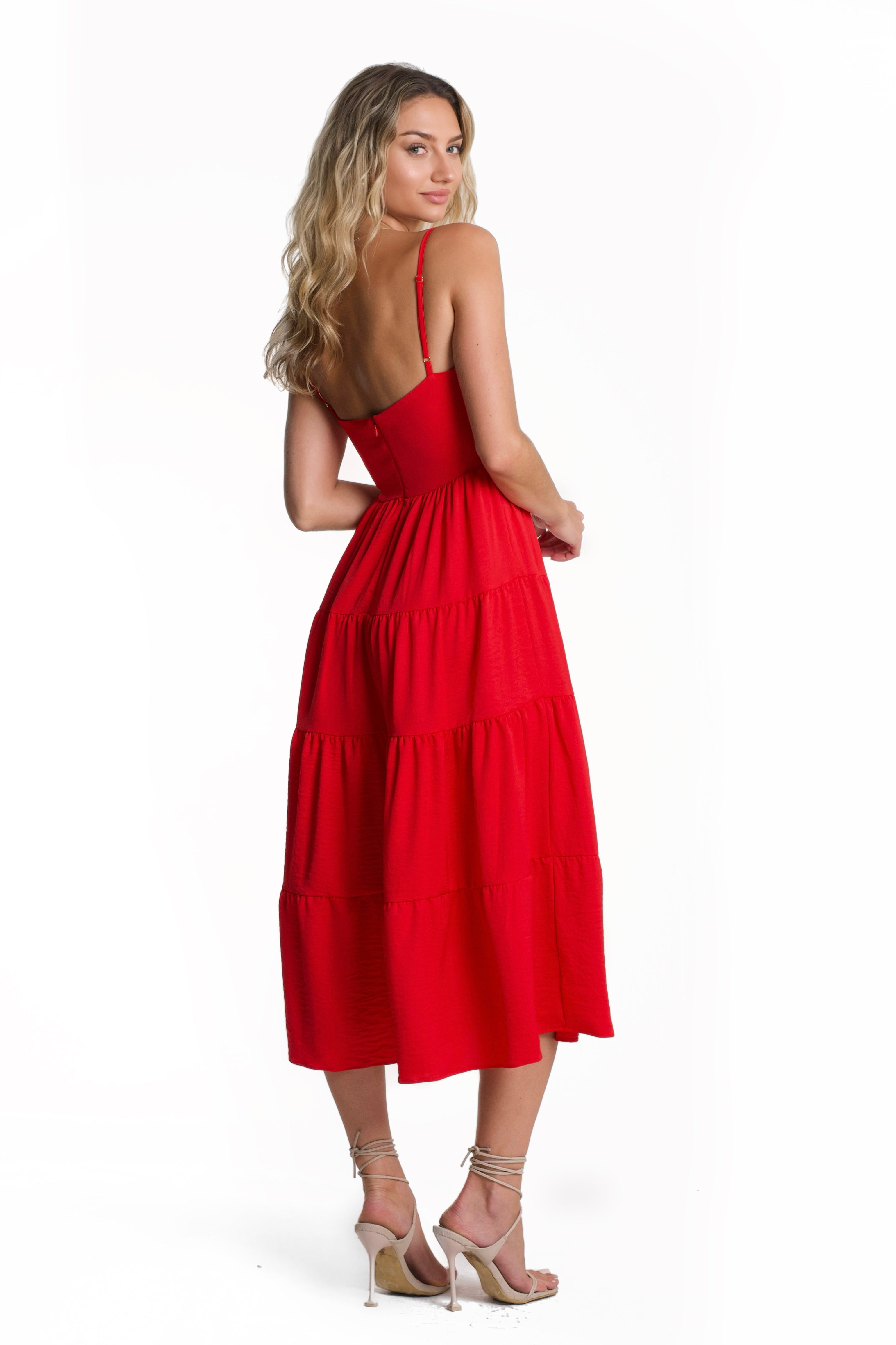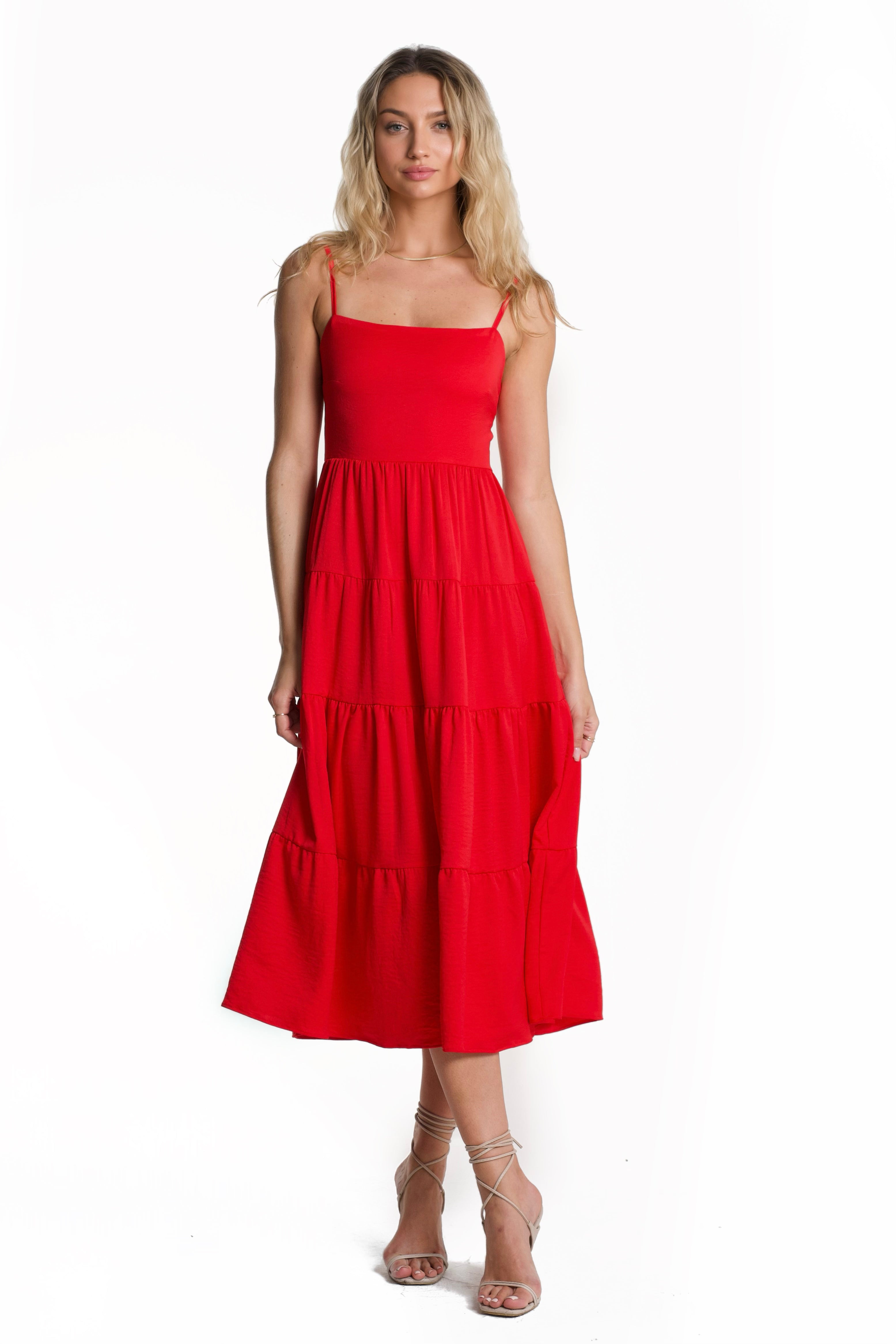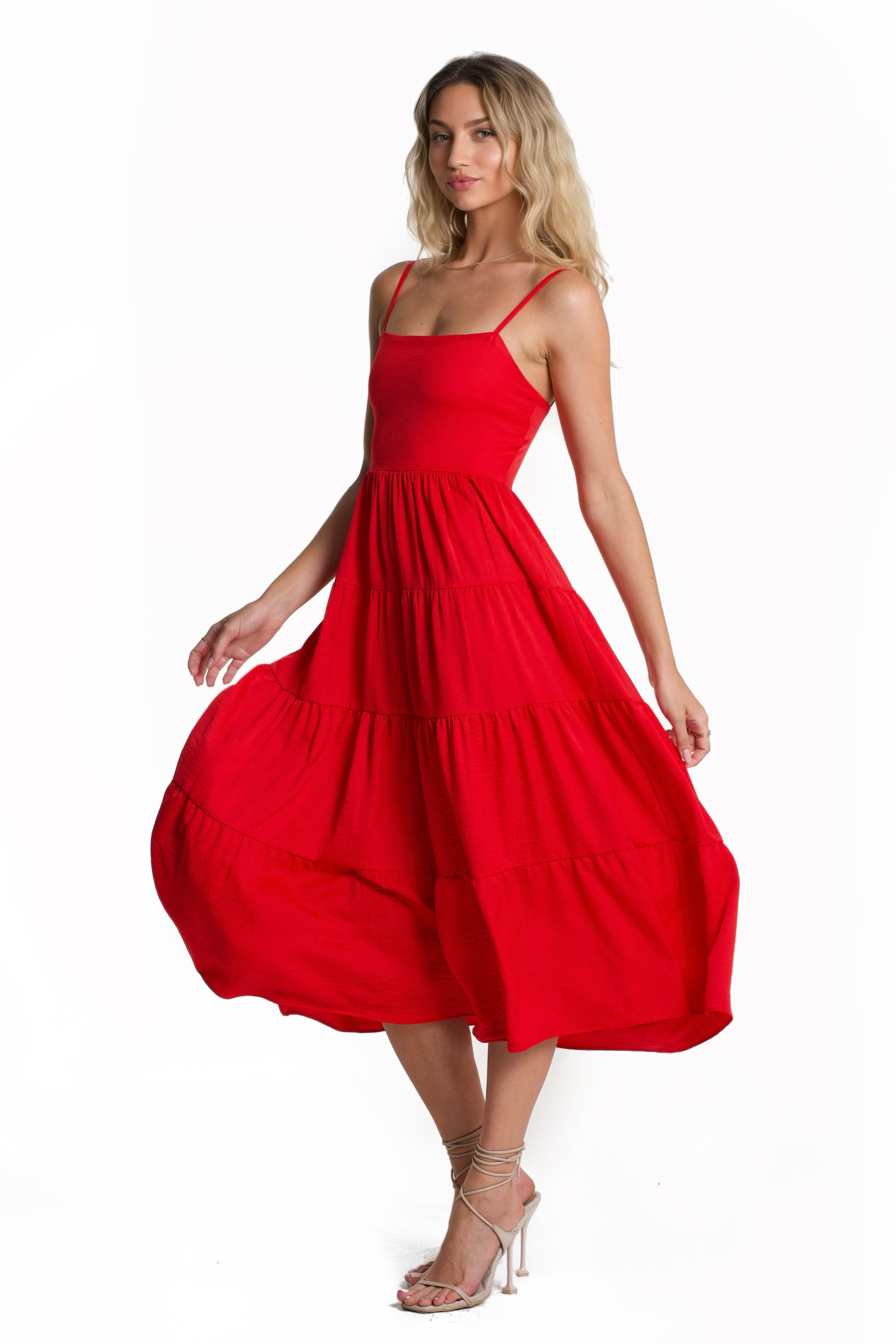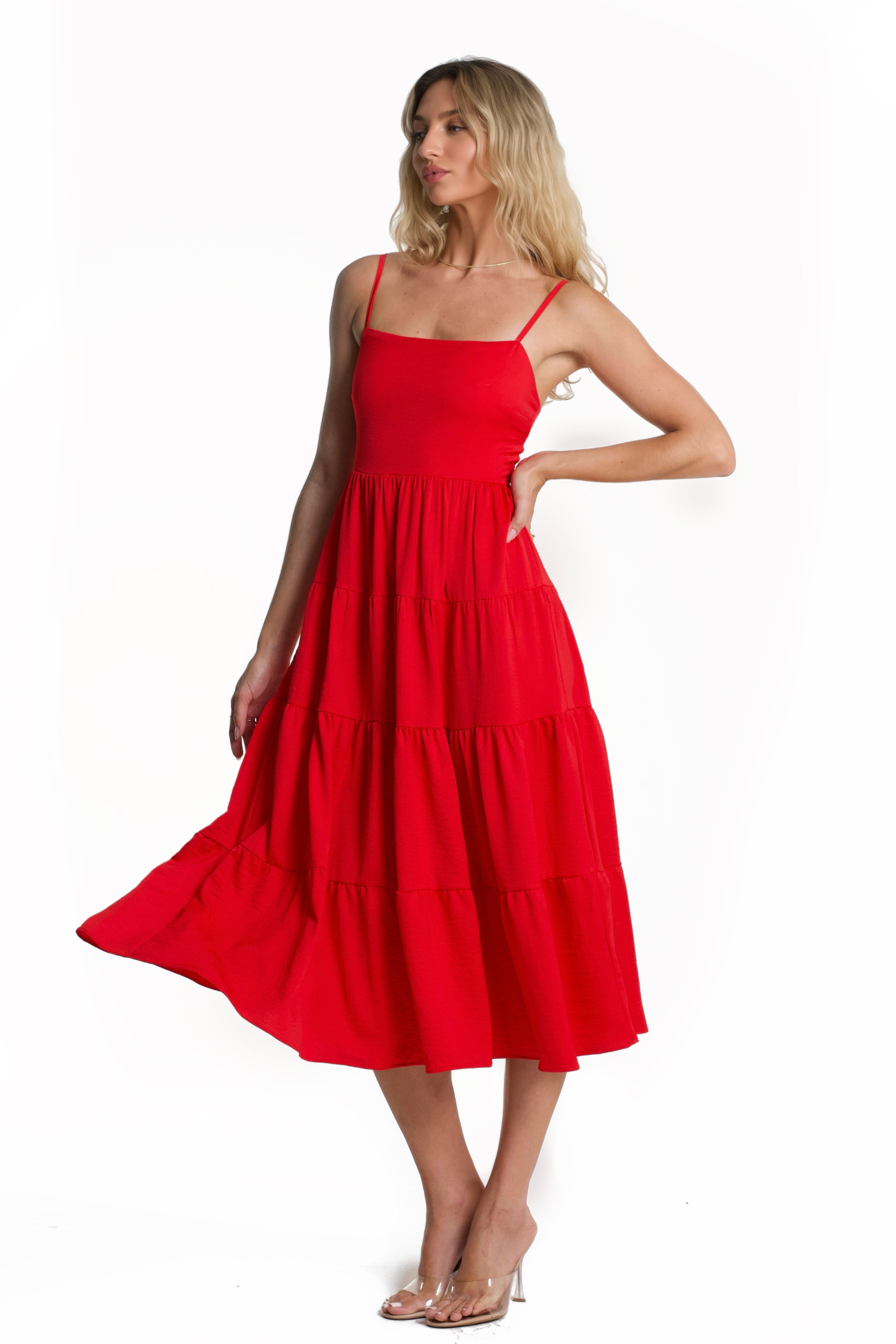 Make a striking statement in the Melina Summer Dress. She features a sculpting bodice, thin shoulder straps and a voluminous tiered skirt.