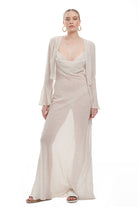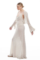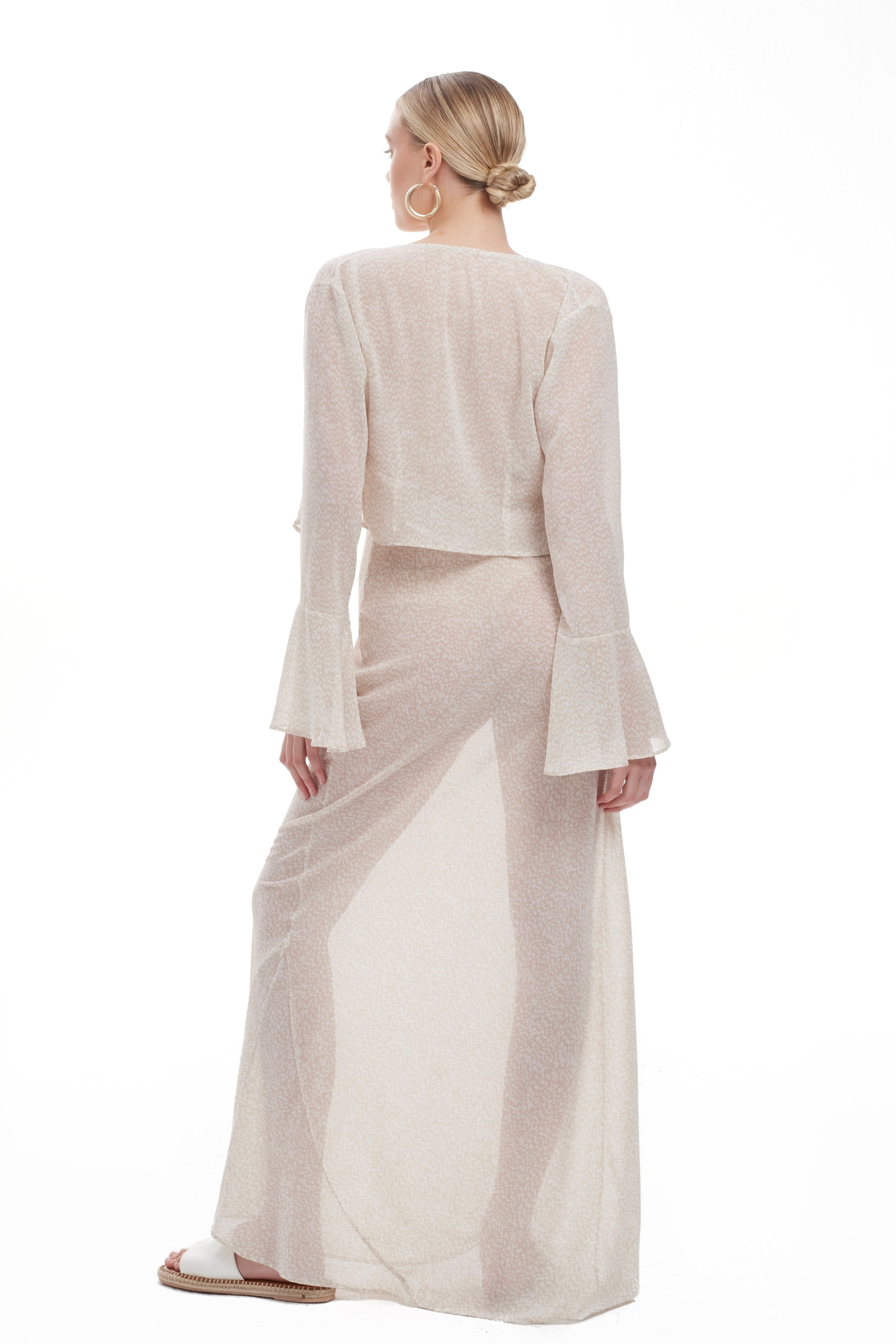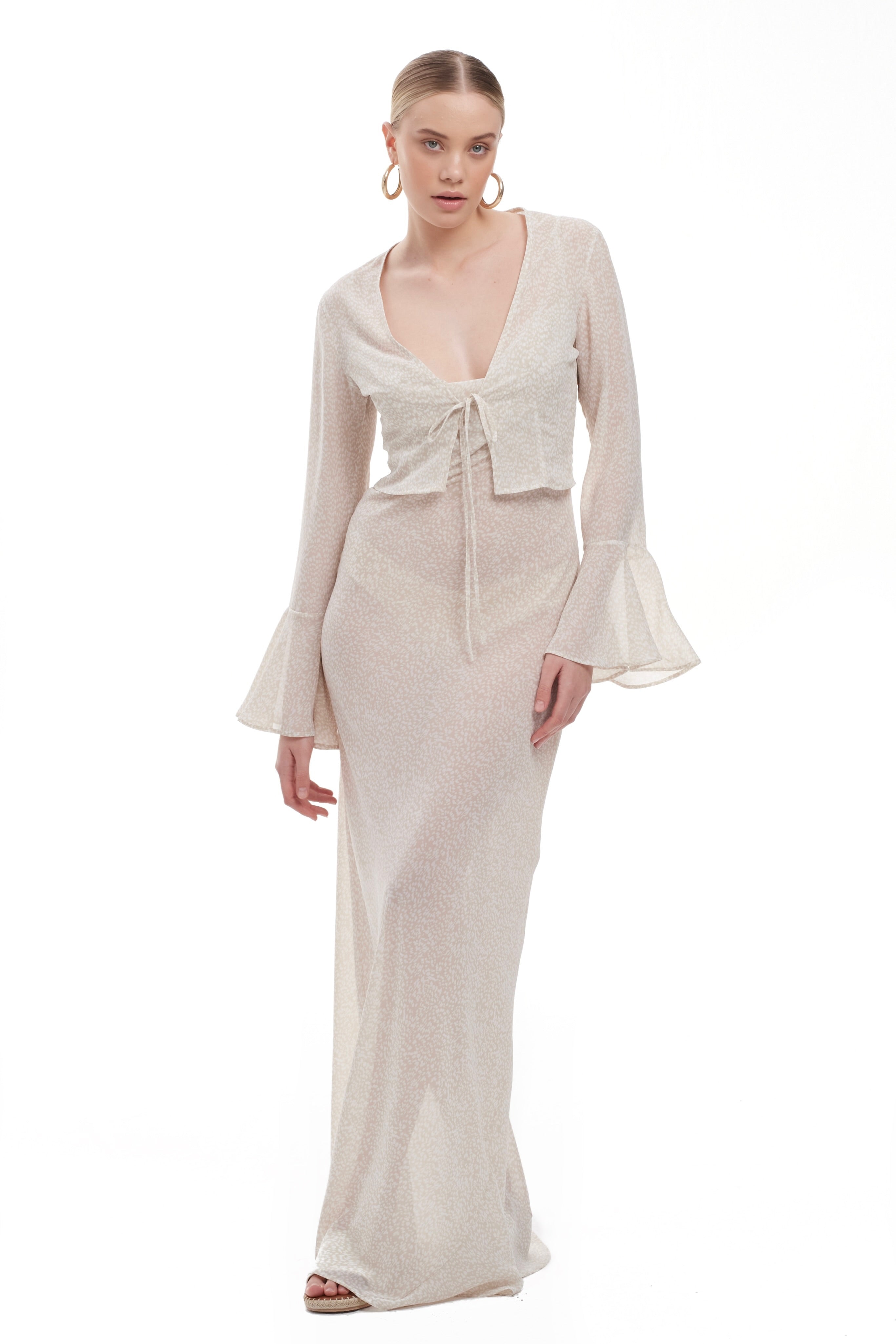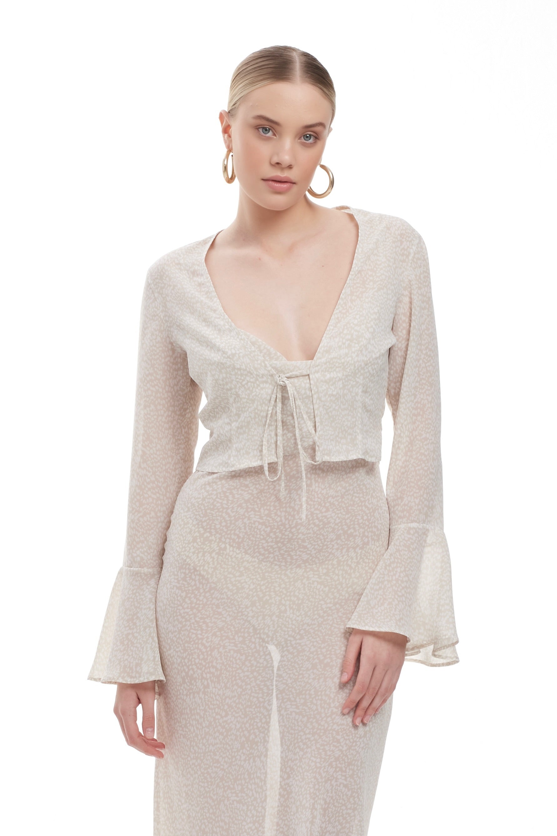 The frill sleeve details bring a feminine flair, while the front ties offer a customisable fit and a charming finish. Designed to pair seamlessly with the Alyssa Semi-Sheer Cowl Neck Dress or to stand alone as a statement piece, this cropped blouse is versatile and stylish.
