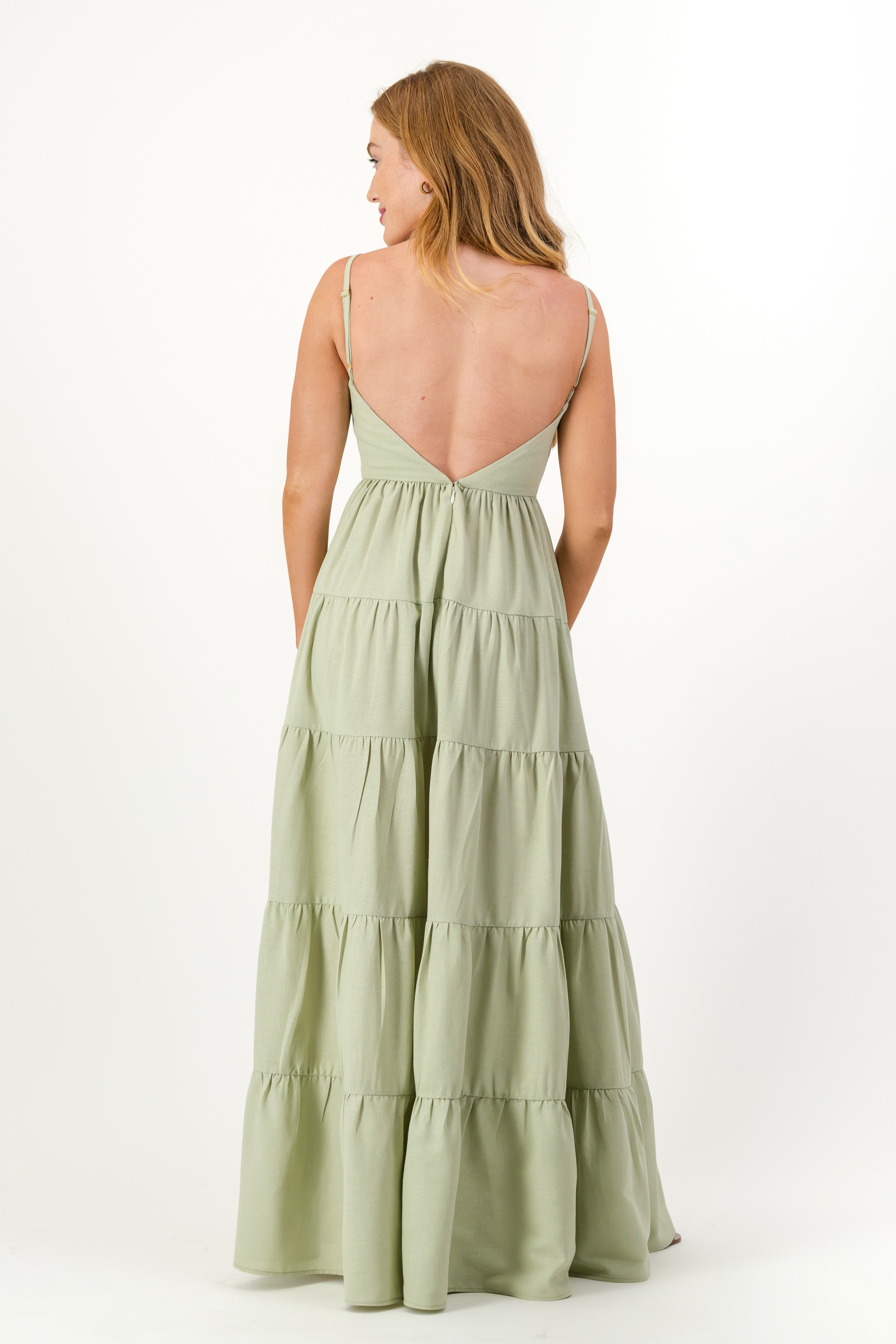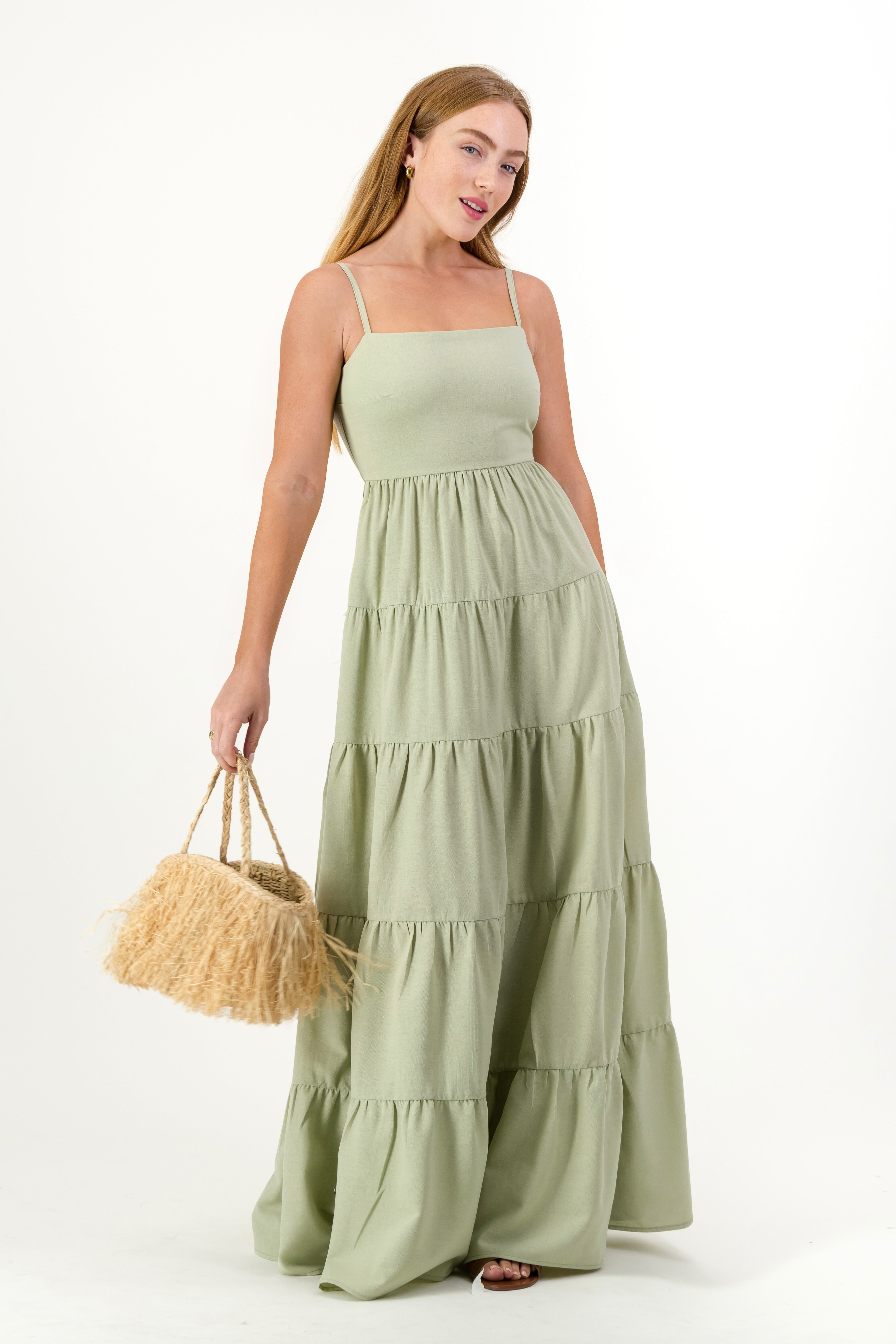 The Avery Summer Dress is the definition of easy elegance. With a clean square neckline, delicate straps, and a softly fitted bodice, it falls into a tiered maxi skirt that moves beautifully with every step. The moment is the V-shaped back — subtle from the front, unforgettable as you turn.