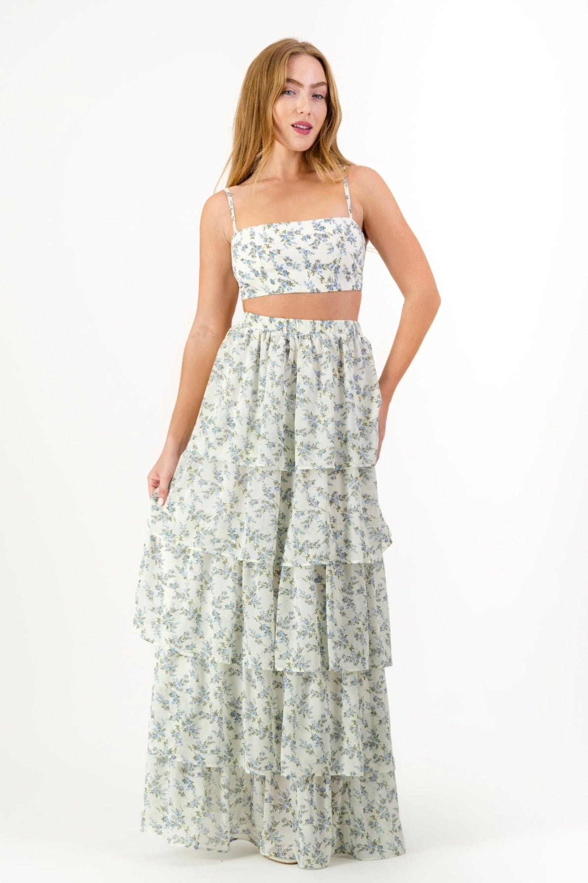 The Delilah Frill Skirt is light, feminine, and easy to wear. Designed in a soft floral print with cascading tiers, it creates beautiful movement while keeping the silhouette relaxed and flattering. The elasticated waistband offers comfort and flexibility, making it perfect for long summer days.