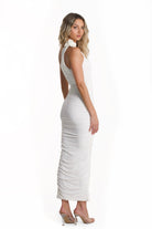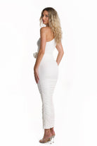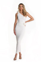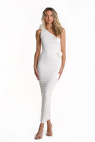 Elle Rose's ruched construction allows silhouettes to gracefully drape across the figure. The Maxi dress showcases an asymmetric, one-shoulder neckline adorned with gentle gathers, enhancing the form-fitting silhouette with a touch of elegance and embellished with corsage detail.