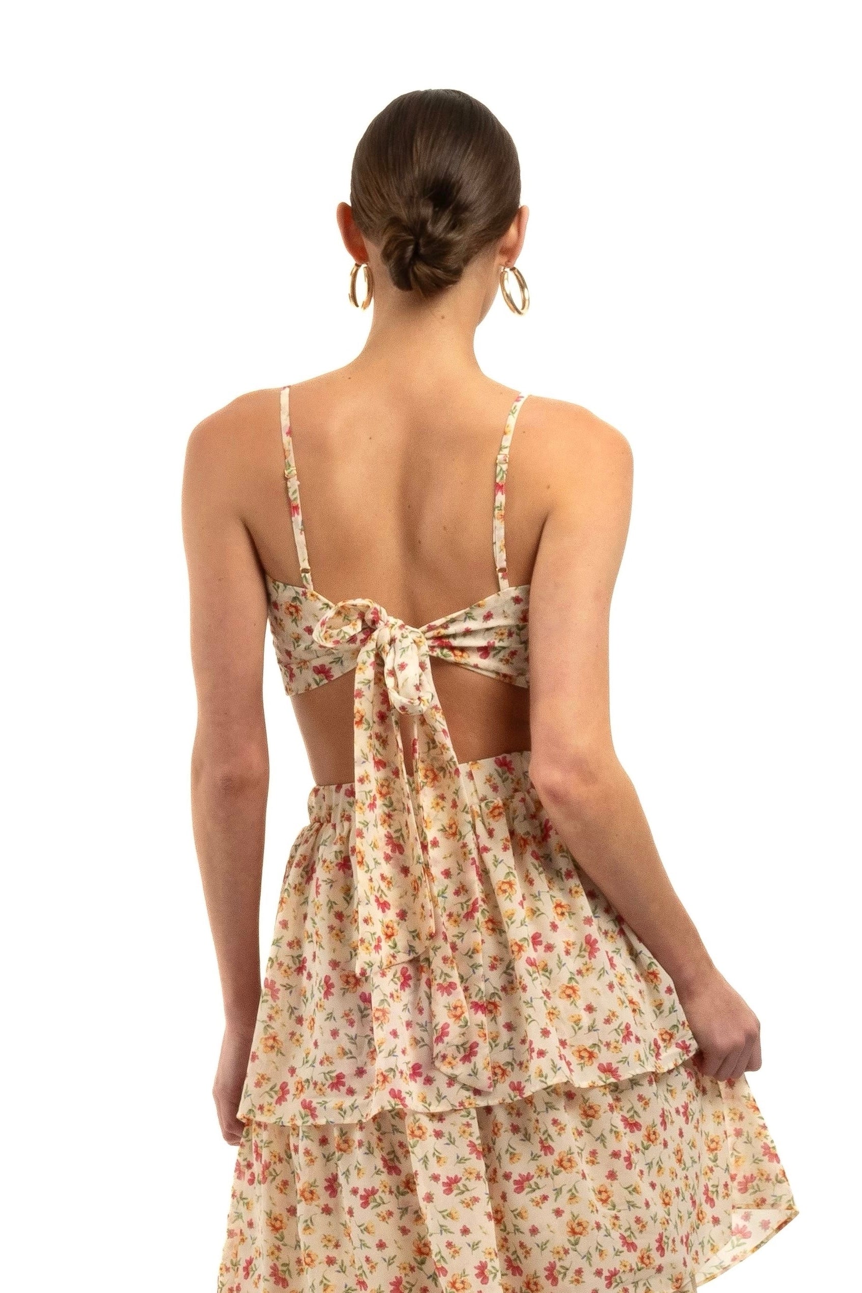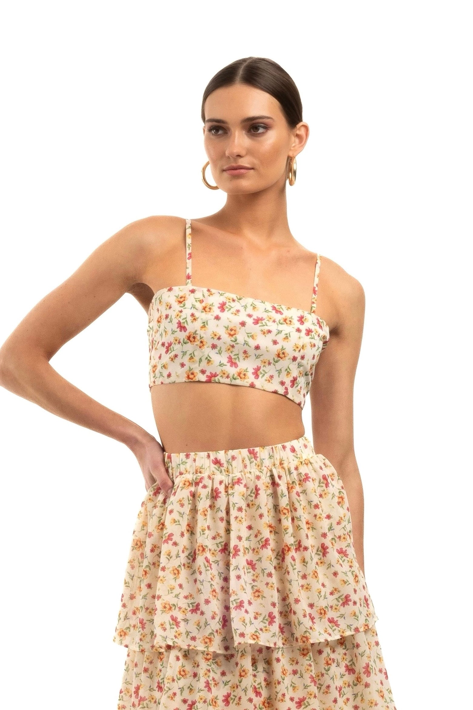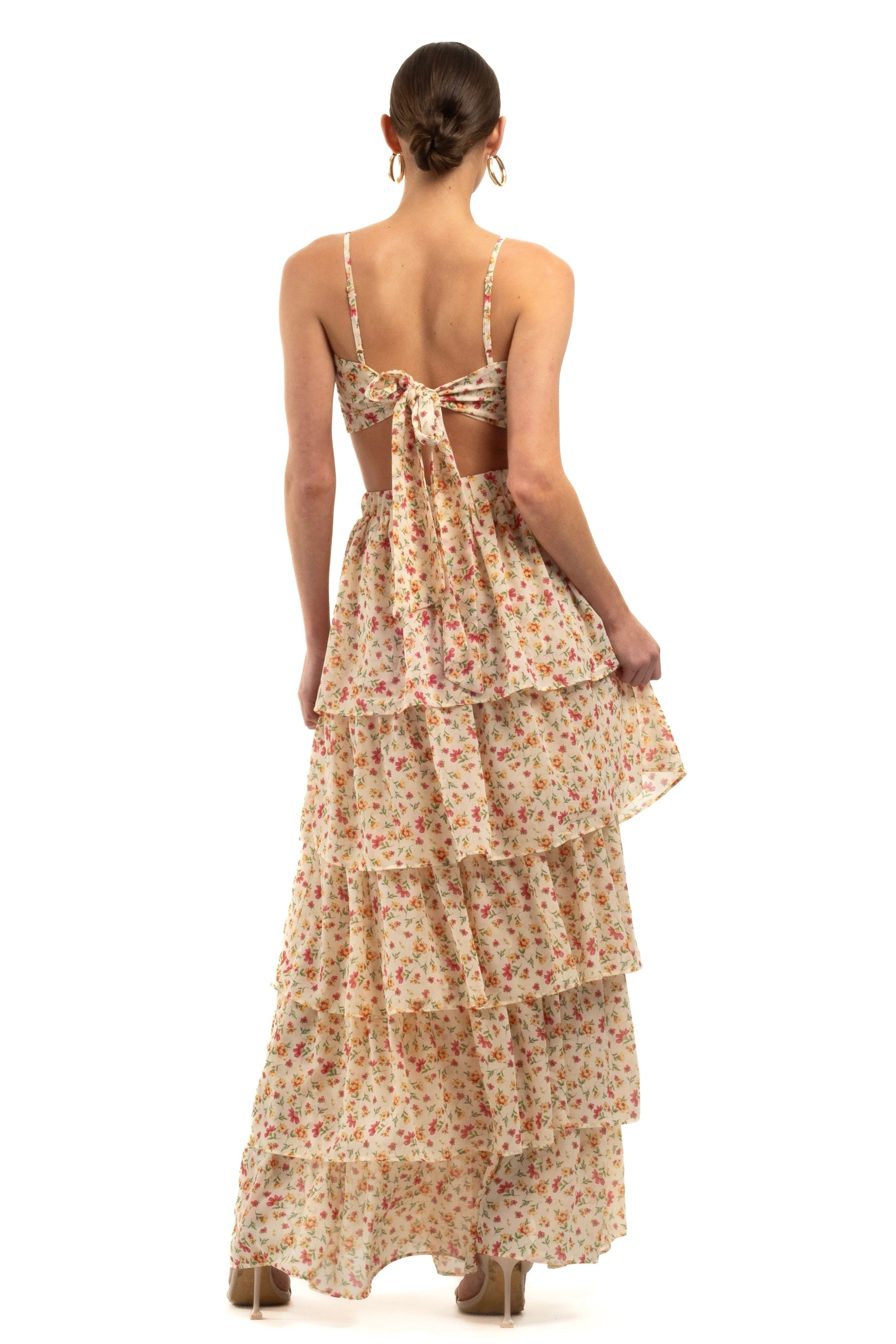Complete your look with our Leorah Bandeau, designed to pair perfectly with our Leorah Maxi Frill Tiered Skirt. This charming bandeau is crafted from the same lightweight floral chiffon, ensuring a cohesive and stylish ensemble. The Bandeau features adjustable straps and tie details at the back, providing a customizable fit and added comfort.