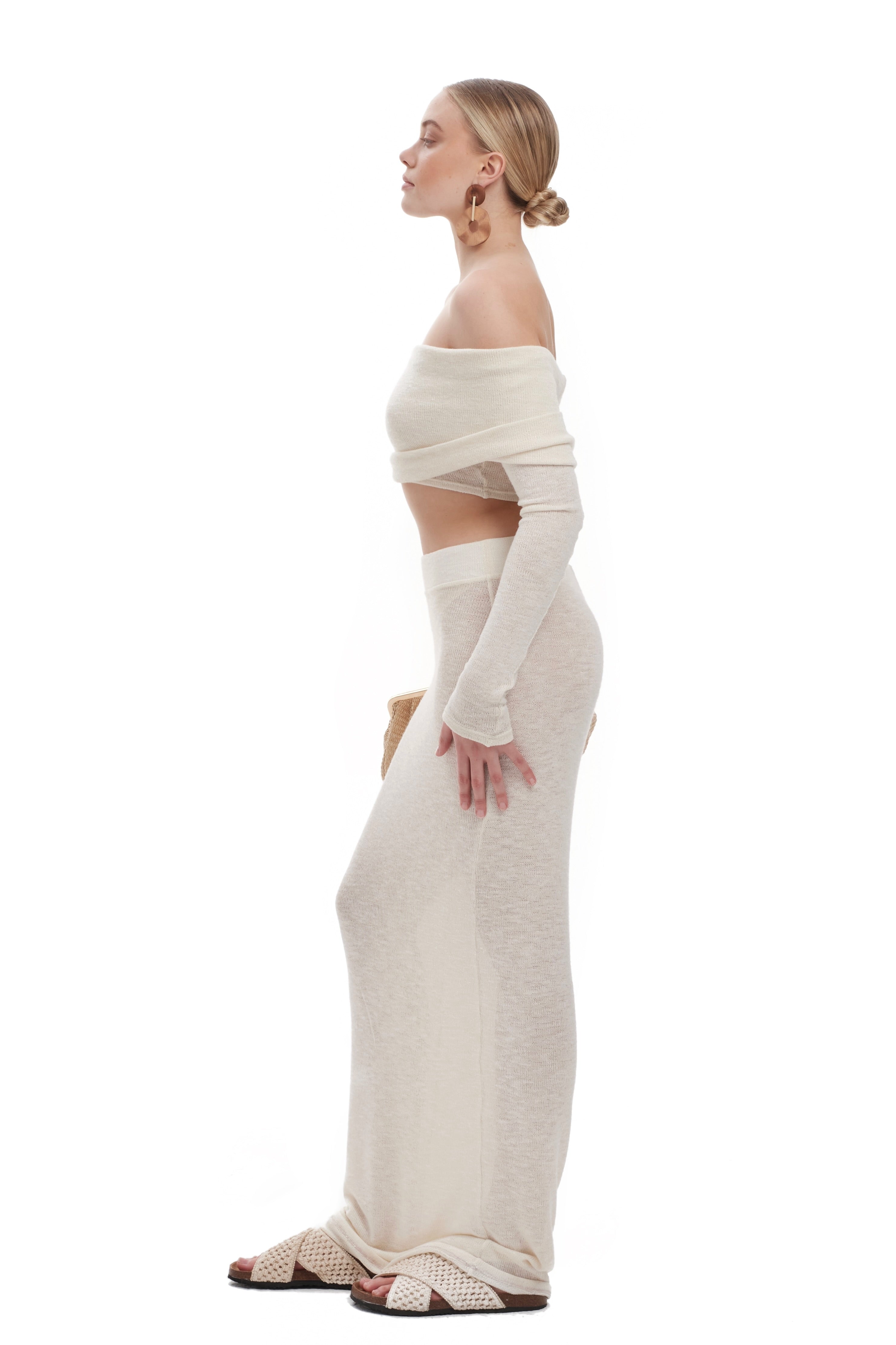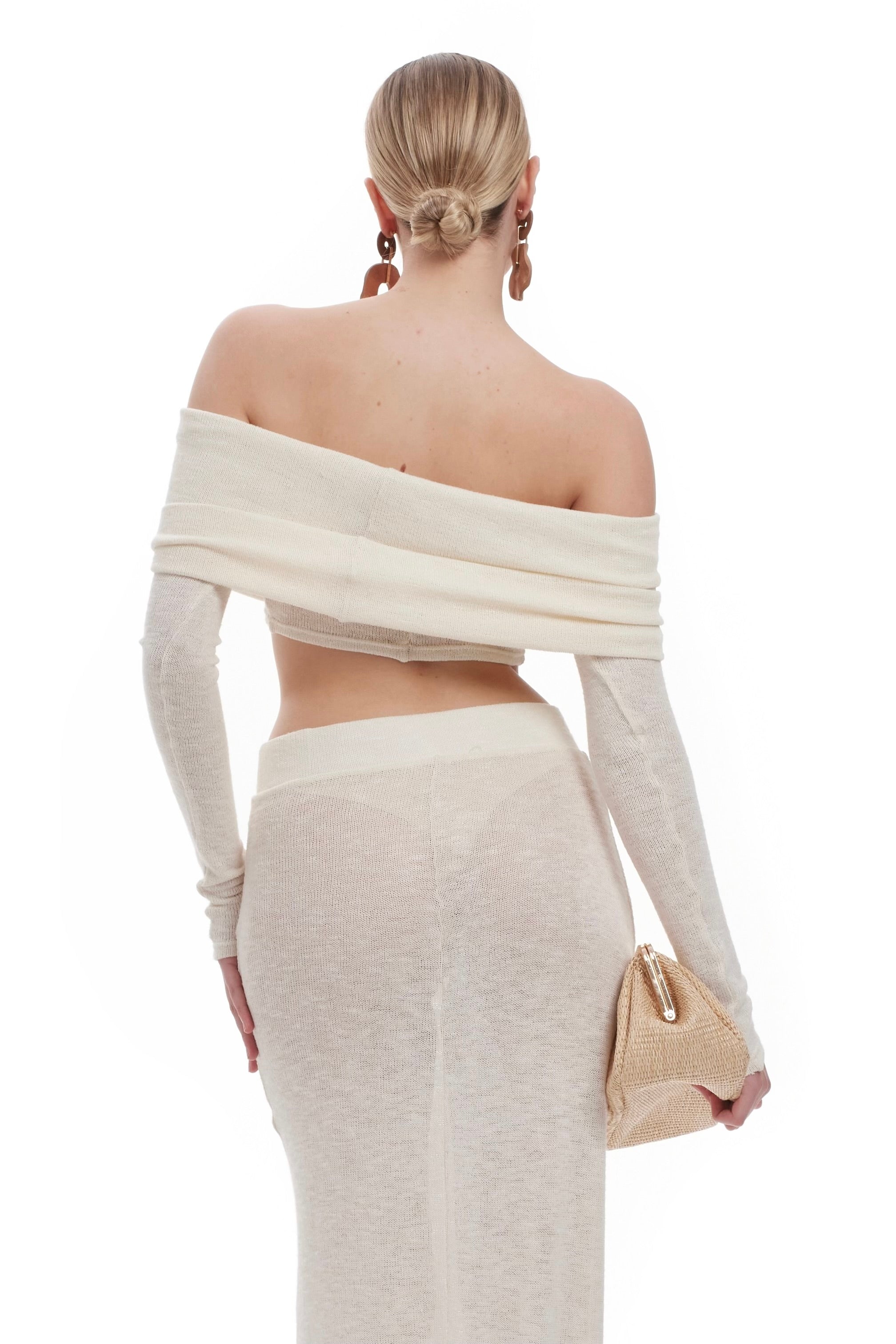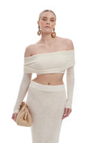 The tops in the Mia Collection include a Long Sleeve Off-shoulder Top and a Sleeveless Off-shoulder Top. The Long Sleeve Top is cropped with a fold-over cuff neckline, combining sophistication with a relaxed resort vibe. The Sleeveless Top shares the same chic design but without the sleeves, perfect for warmer days.